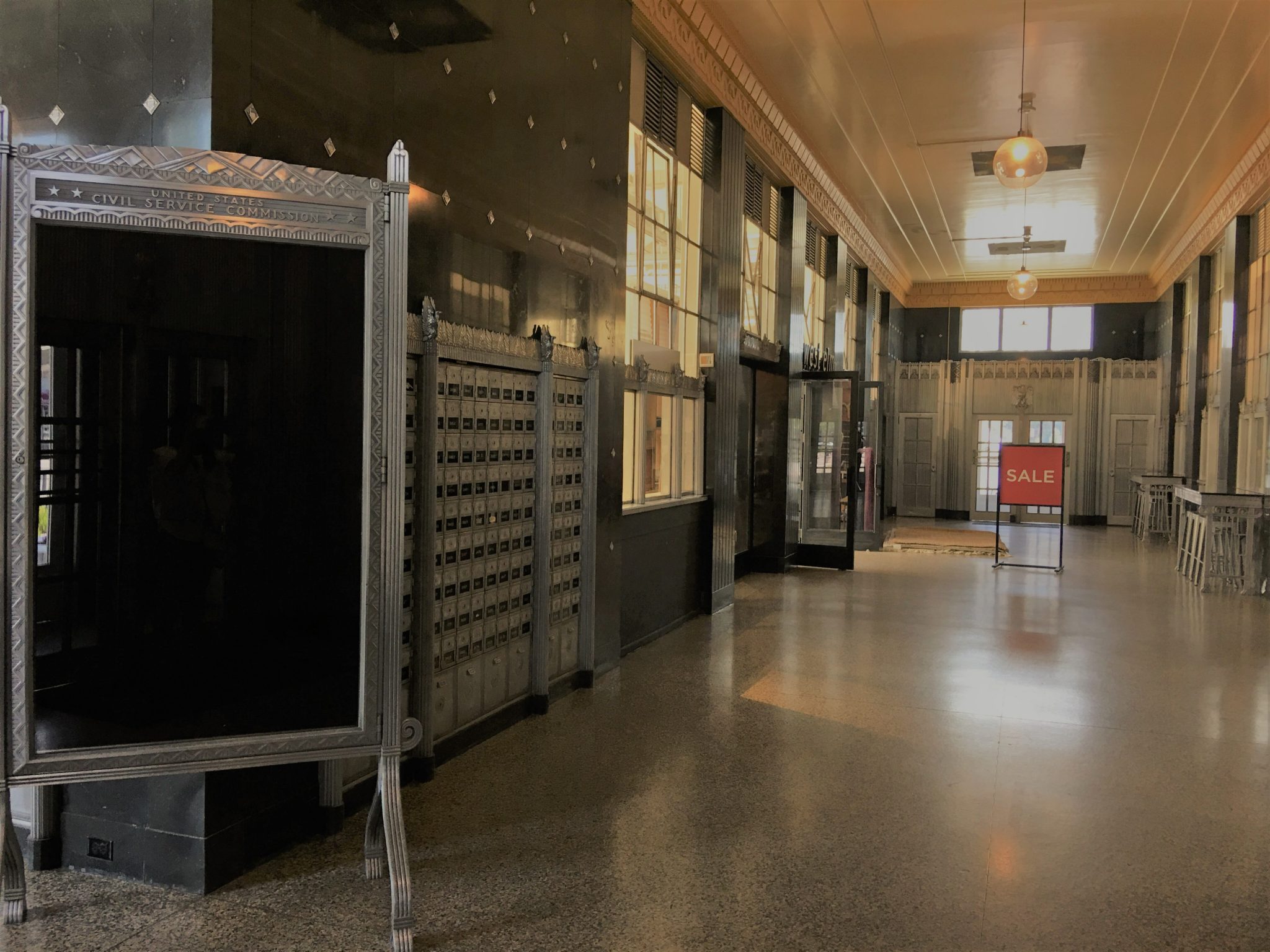 現在も使用可のレトロなアルミニウム製エレベーター。ドアの彫りが素敵。上階には農業省、復興省、労働局、退役軍人局、気象庁、FBI、税務庁、社会保障庁、海兵隊、海軍等々の支所や事務所がかつて入っていたそうです。現在はそれらは全て他所へ移設しており、一般民間企業が上階に入居するようです。